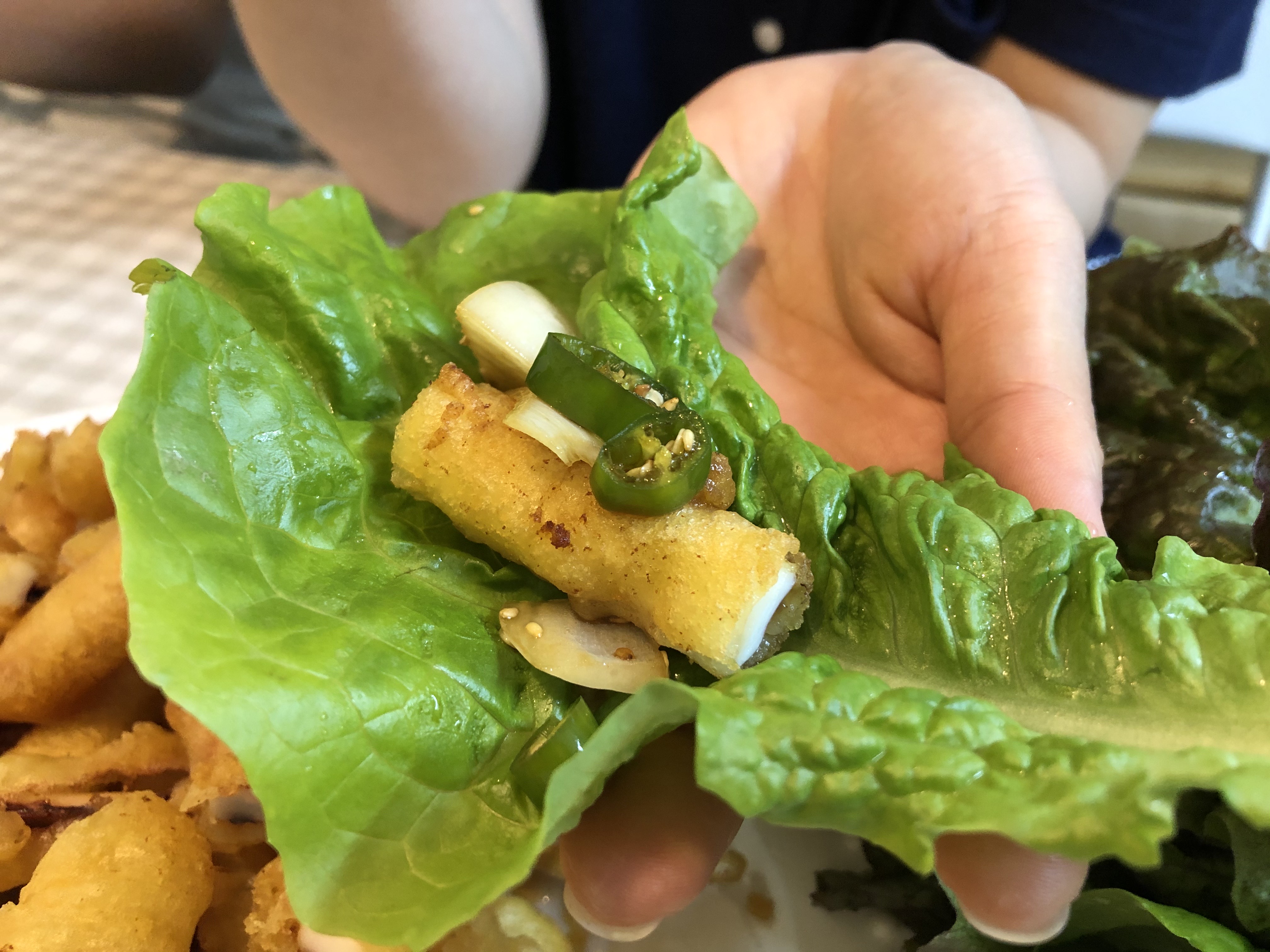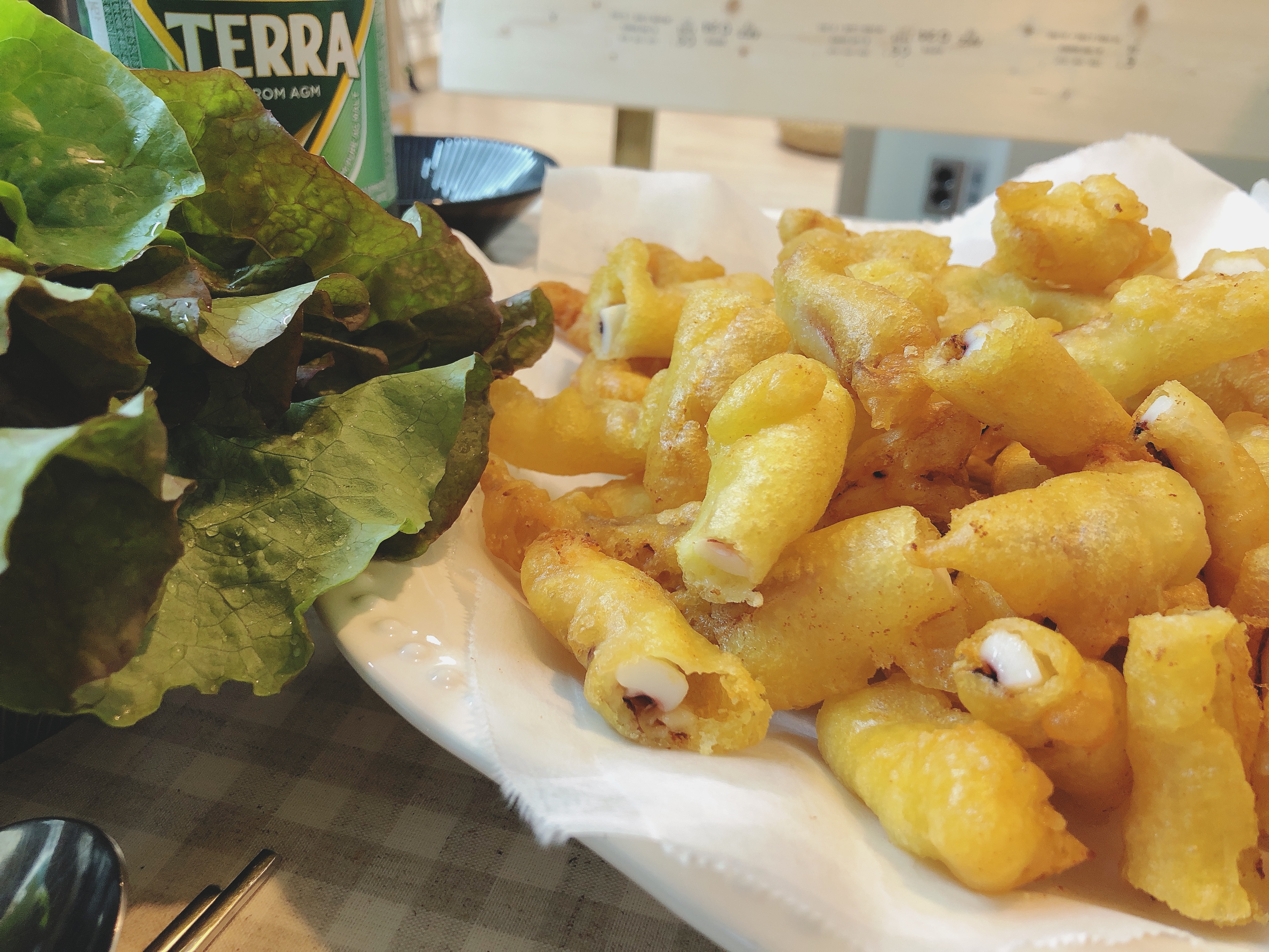 오징어 튀김을 상추위에 올리고 간장 소스에 있는 썰은 양파와 청양고추 몇 조각을 올린 후 티스푼으로 간장을 넣고 쌈싸면 끝입니다. 상추의 아삭함과 양파와 고추의 매운맛, 오징어 튀김의 바삭함과 기름진 풍미가 어울지고 간장 소스의 새콤한 맛의 조화는 상추튀김 말고는 맛보기 어려우실 겁니다! 어려운 요리가 아니니 한번 도전해보세요. 맥주 안주로도 아주 훌륭한 음식입니다.