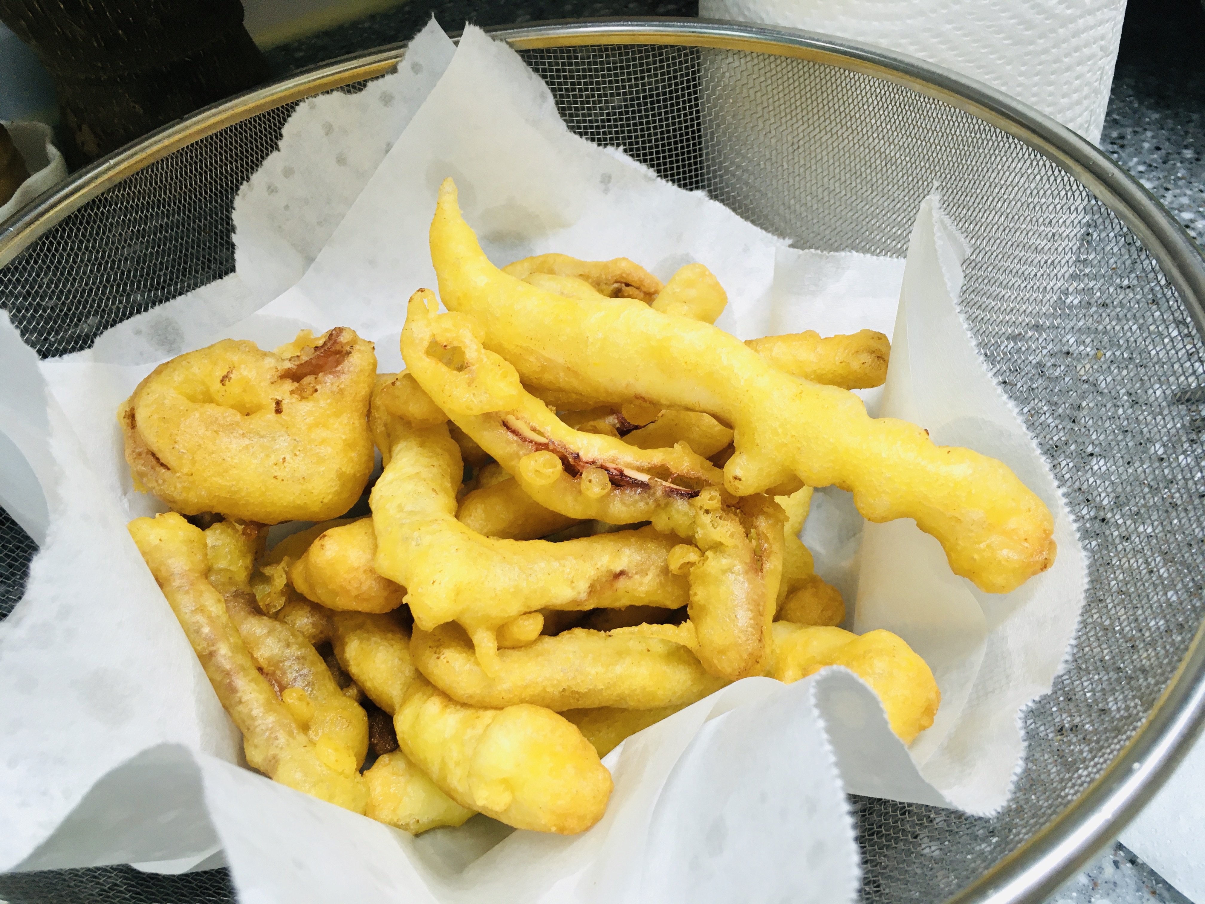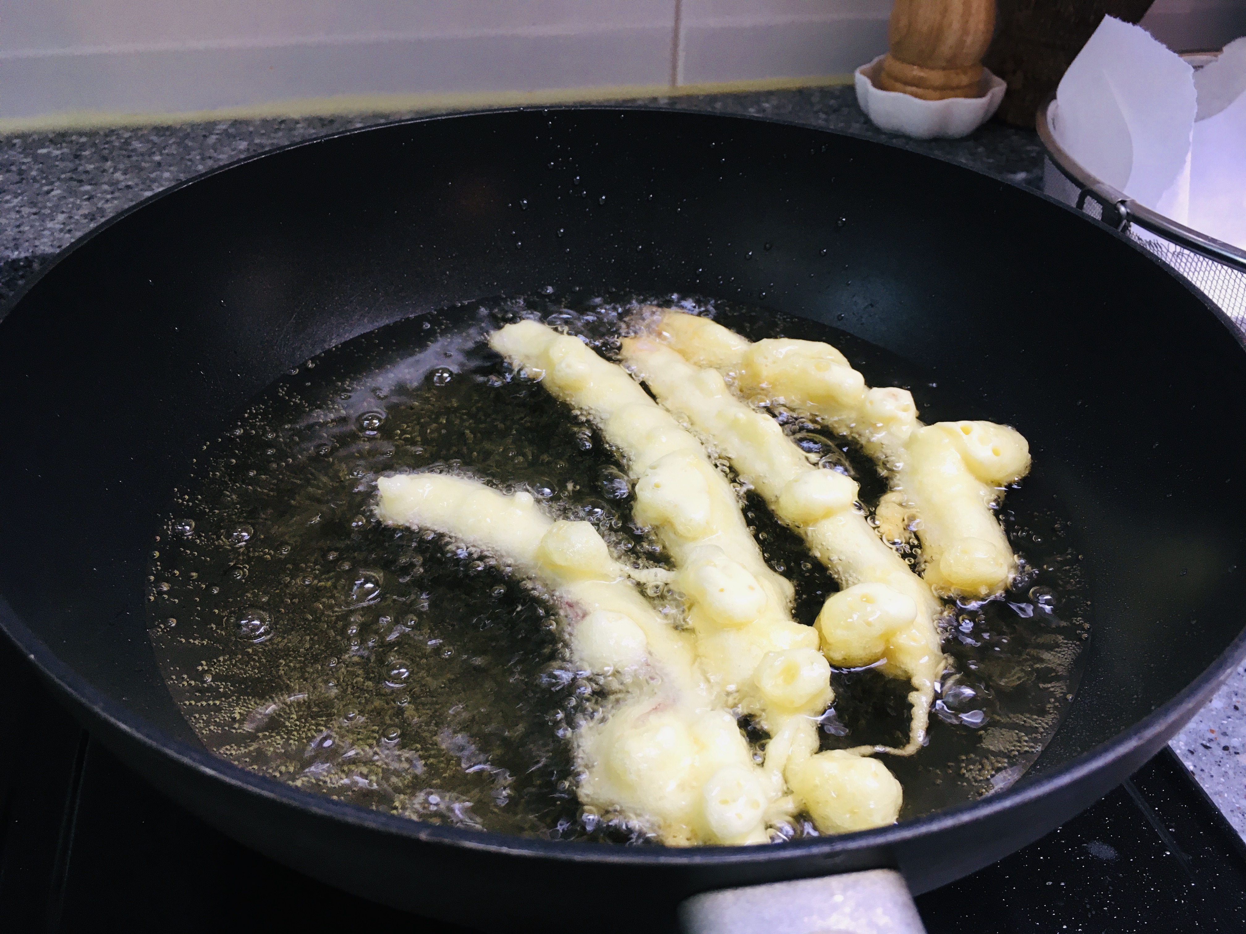 튀김옷을 입힌 오징어가 기름에 투하되는 시간이네요! 튀김옷이 둥글게 부풀어 오르기도 하는데 그러다가 갑자기 기름이 튈 수도 있으니 조리하실 때에는 가급적 긴팔과 손을 저심하셔야 겠네요.