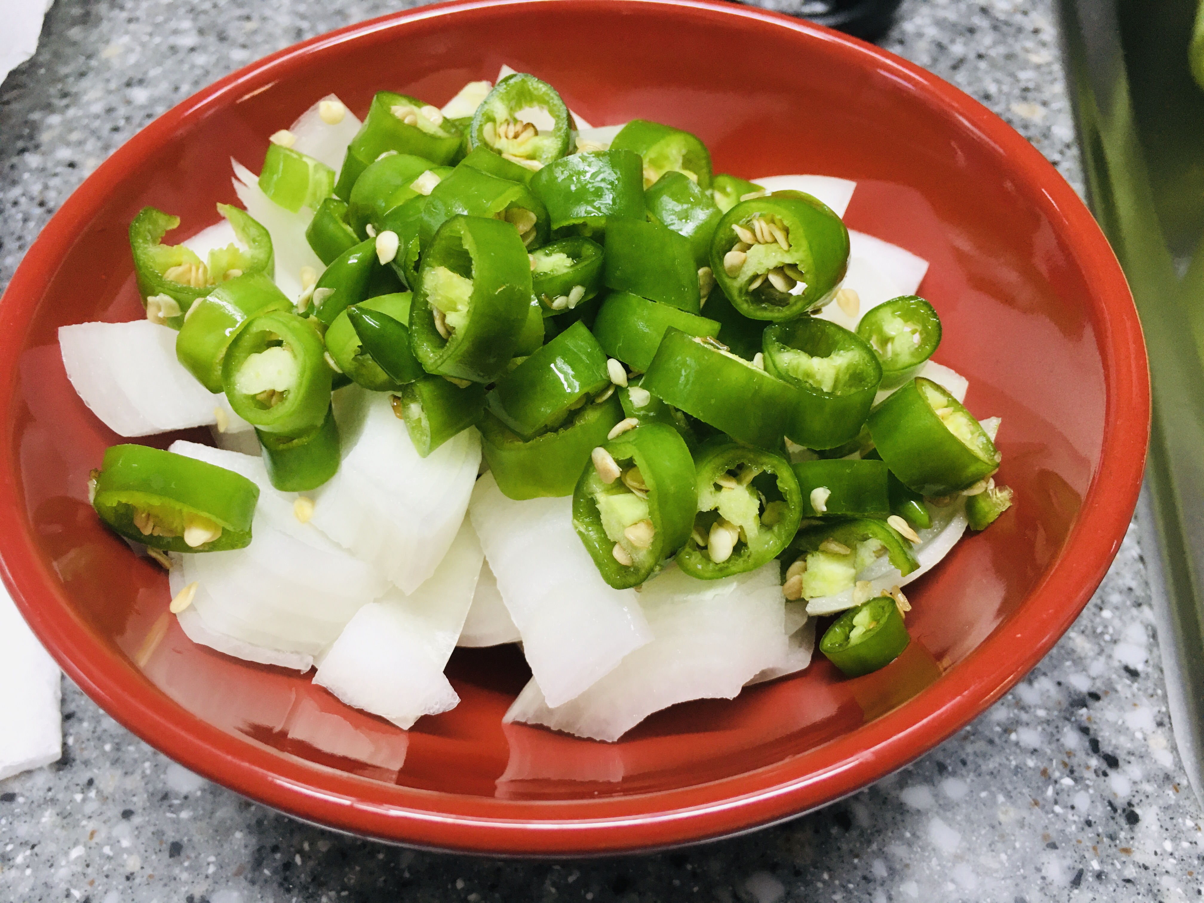 상추 튀김에 꼭 들어가야할 간장 소스입니다. 간장과 식초 또는 레몬즙을 섞어서 만들어도 되지만 집에 장아찌를 담군 간장이 있다면 그 간장을 베이스로 하시면 아주 좋습니다. 그리고 썰은 양파와 매운 청양고추를 넣어 함께 섞으면 끝입니다.